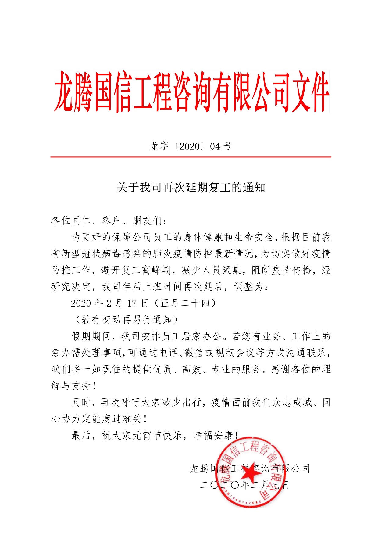關(guān)于我司再次延期復(fù)工的通知