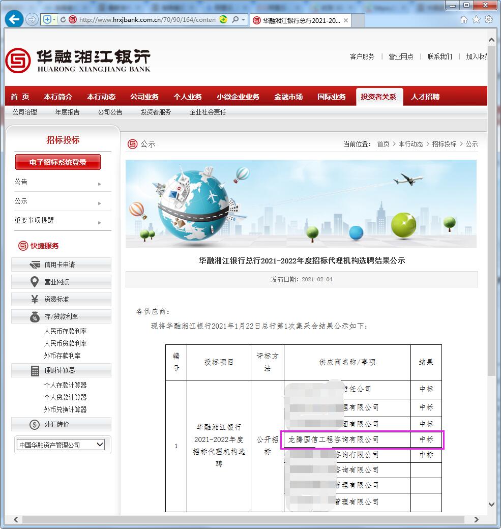 恭賀我司中標(biāo)華融湘江銀行總行2021-2022年度招標(biāo)代理機構(gòu)庫