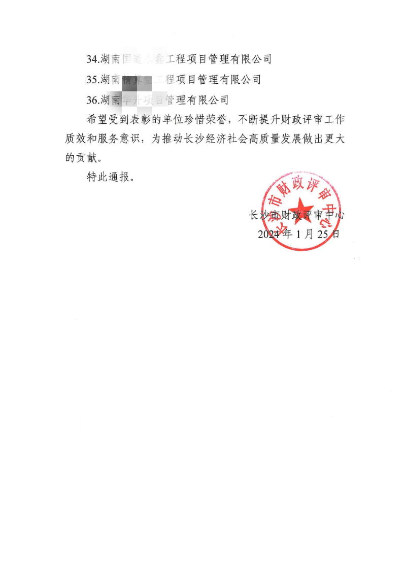 根據(jù)《長沙市財政評審中心委托造價咨詢供應商評審項目管理辦法》(長財評〔2022〕3號)及相關考核細則要求,長沙市財政評審中心近期組織對2023年度已出具評審報告的相關單位開展了年度考評。經(jīng)長沙市財政評審中心班子會議研究決定,依據(jù)項目評審質量、完成時效、響應程度及各方反饋等情況,根據(jù)對年度項目考核優(yōu)秀、評審服務保障優(yōu)異的精選層單位評選,我單位龍騰國信工程咨詢有限公司被評為2023年度“優(yōu)秀服務單位”。