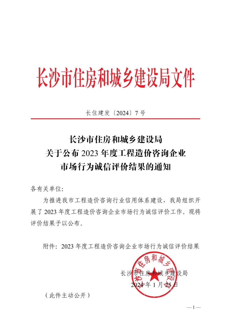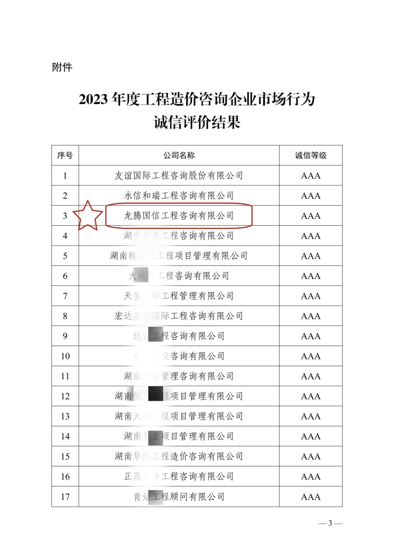 近日,長沙市住房和城鄉(xiāng)建設(shè)局公布了長沙市2023年度工程造價咨詢企業(yè)市場行為誠信評價結(jié)果的通知,我單位榮獲“工程造價咨詢企業(yè)誠信評價AAA”等級。
