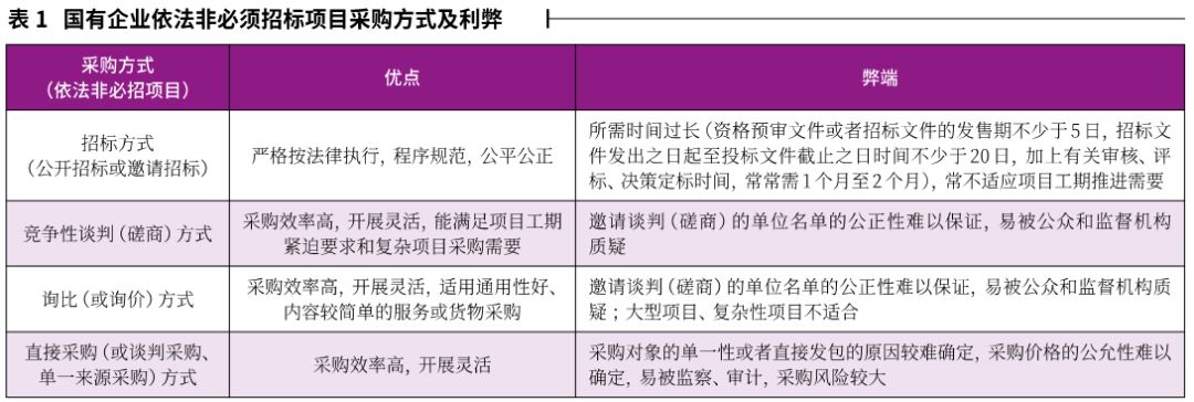 對于國有企業(yè)依法非必須招標項目,可以選擇招標方式,也可以選擇競爭性談判、競爭性磋商、詢比(或詢價)、直接采購(或談判采購、單一來源采購)等方式,這些方式各有利弊,具體見表1。