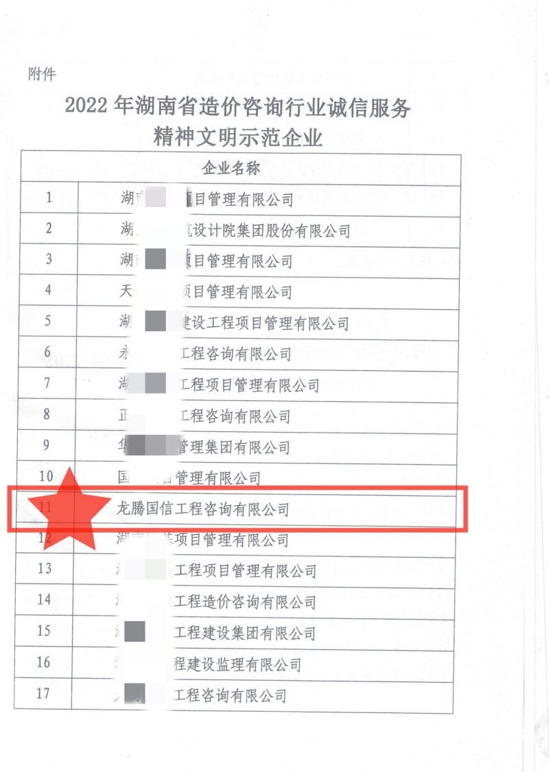 根據(jù)《湖南省建設(shè)工程造價管理總站關(guān)于印發(fā)<湖南省造價咨詢行業(yè)誠信服務(wù)精神文明示范企業(yè)動態(tài)管理實施辦法(試行)>的通知》(湘建價辦〔2020〕47號)和《湖南省建設(shè)工程造價管理總站關(guān)于印發(fā)<湖南省造價咨詢行業(yè)誠信服務(wù)精神文明示范企業(yè)動態(tài)管理指導(dǎo)性操作細(xì)則(2022年度)>的通知》(湘建價政〔2022〕50號)要求,我站對按時提交2022年湖南省造價咨詢行業(yè)誠信服務(wù)精神文明示范企業(yè)建設(shè)活動資料的企業(yè),嚴(yán)格按照實地考察、材料審核、現(xiàn)場驗收、信用信息查詢等環(huán)節(jié)進行評價,并予以公示,龍騰國信獲評“示范企業(yè)”。