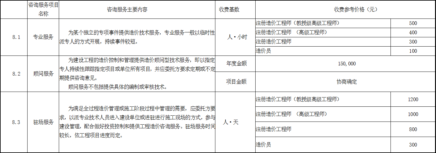 3、全過程造價咨詢服務(wù)駐場人員根據(jù)工程項目情況及委托人要求確定,駐場人員的收費價格參考“造價咨詢工日收費參考價格表”。